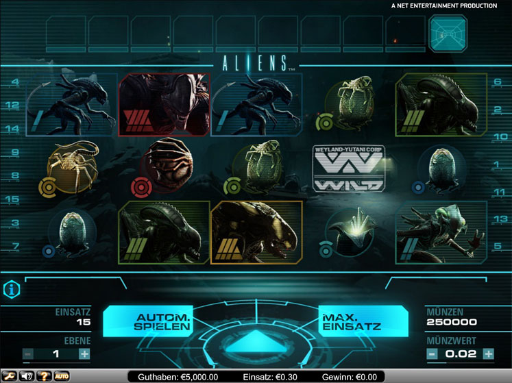 Der Aliens Casino online Slot wurde vom schwedischen Spielehersteller NetEnt in Zusammenarbeit mit den Filmproduzenten von 20th Century Fox erstellt und bietet ein unvergleichliches Online Glücksspielerlebnis, das vor allem deutsche Automatenzocker begeistert. Wie in den Alien Horrorfilmen schlüpfen Sie hier in die Rolle eines Soldaten und machen sich in einem Raumschiff auf die Jagd nach dem Nest der Alien Brut, um den insektenartigen Monstern von einem fremden Planeten den Garaus zu machen. Der Aliens Spielautomat ist dabei nichts für schwache Nerven und schon gar nichts für schreckhafte Zocker, denn das Spiel ist ein mitreißender Horrorschocker, der an passender Stelle Videosequenzen und Effekte einspielt, die einem das Blut in den Adern gefrieren lassen. Untermalt ist das Ganze von einem furchteinflößenden Sound, der bei der Erstellung dieser Aliens Slot Bewertung in unserer Redaktion für Gänsehaut sorgte.