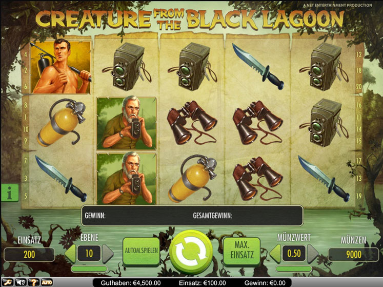 Der Creature from the Black Lagoon Slot wurde vom Online Casinospieleentwickler NetEnt in Zusammenarbeit mit den Filmproduzenten der Universal Studios geschaffen und stellt eine Hommage an den im Jahr 1954 veröffentlichten, gleichnamigen Horrorfilm (Deutsch: Der Schrecken vom Amazonas) dar. So dreht sich beim Creature from the Black Lagoon online Spielautomaten alles um ein fürchterliches Seeungeheuer und die verwegene Crew eines Schiffes, die es mit dem Monster aufnehmen will. Untermalt ist das Spiel an diesem NetEnt Spielautomaten von den typischen Klängen früher Hollywood-Klassiker und sorgt außerdem mit eingespielten Animationen und Filmsequenzen für zusätzliche Spannung. Auch die Gewinnsymbole des Spielautomaten passen perfekt zum Thema und zeigen die tapferen Personen, die dem Ungeheuer das Handwerk legen wollen, und deren Utensilien wie Taucherausrüstung, Ferngläser und Messer.