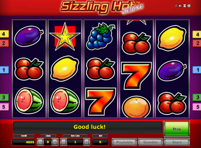 Sizzling Hot bietet dem Spieler fünf Walzen mit jeweils drei angezeigten Bildern. Gewonnen werden kann dabei auf bis zu fünf Gewinnlinien. Die Gewinnlinien erstrecken sich beim Spielautomaten Sizzling Hot Deluxe in Casinos online von links nach rechts und gewonnen wird ab drei aneinandergereihten Symbolen auf einer aktiven Gewinnlinie. Die Kirschen, das Gewinnsymbol mit dem geringsten Wert, zahlen sogar schon ab zwei aufeinanderfolgenden Symbolen. Das Scatter Symbol ist der Stern. Bei den Scattern erzielen Sie einen Gewinn, sobald drei oder mehr im gesamten Bild erscheinen, egal ob diese nun auf einer gemeinsamen Gewinnlinie liegen oder nicht.